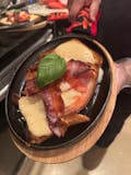 4 halved eggs with your choice of bacon, ham, turkey, brisket, or pork.